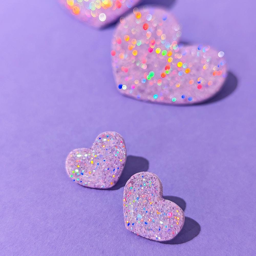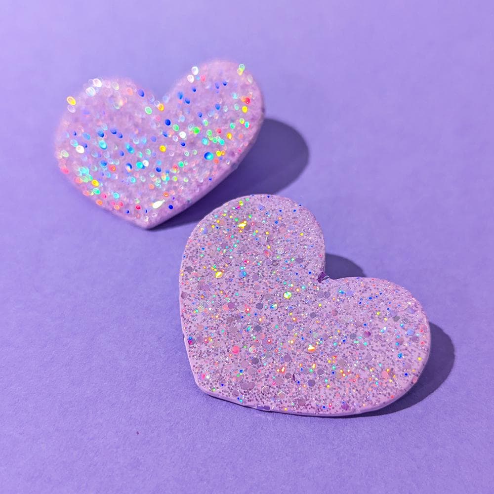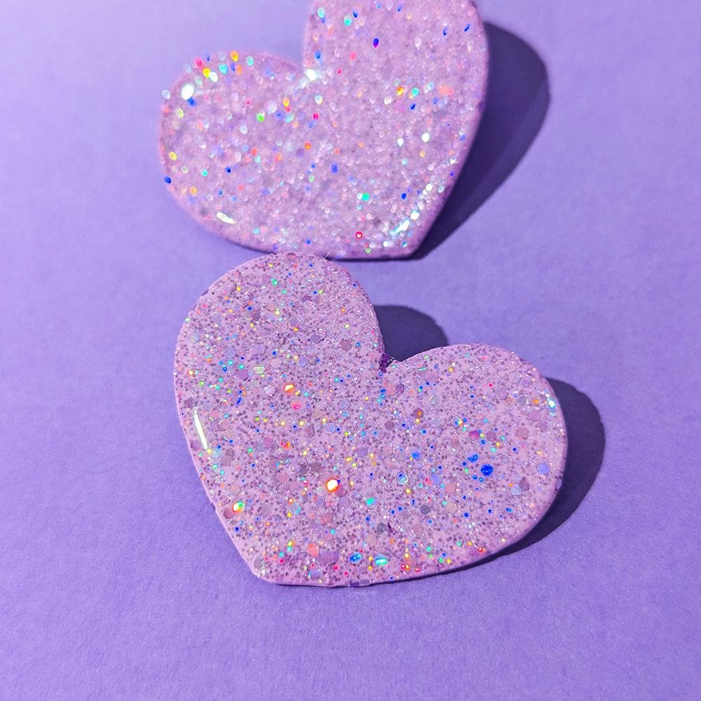 On aime et on le montre, avec ces boucles d'oreilles coeur, qui présentent un surprenant effet pailleté, changeant de couleur selon la lumière!
