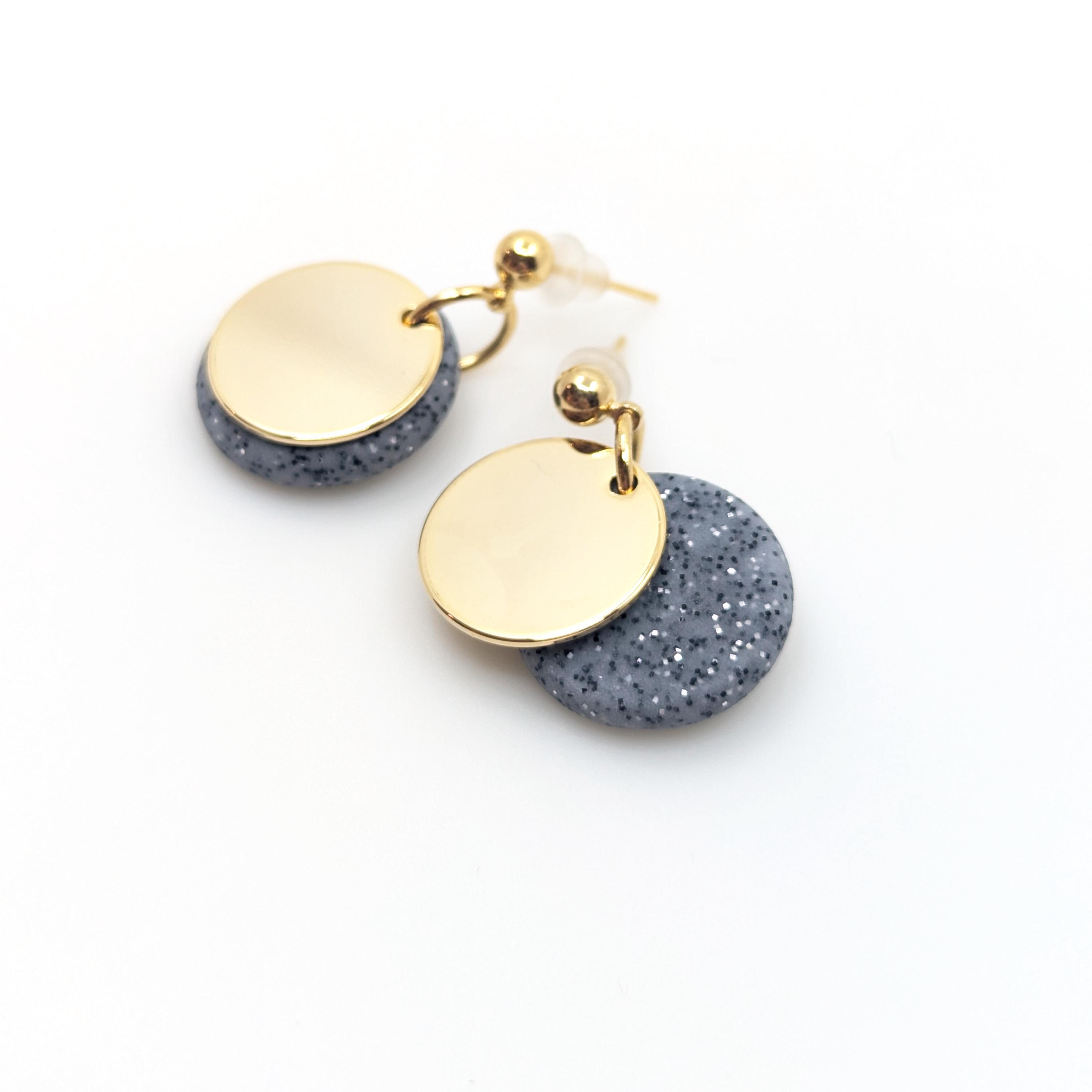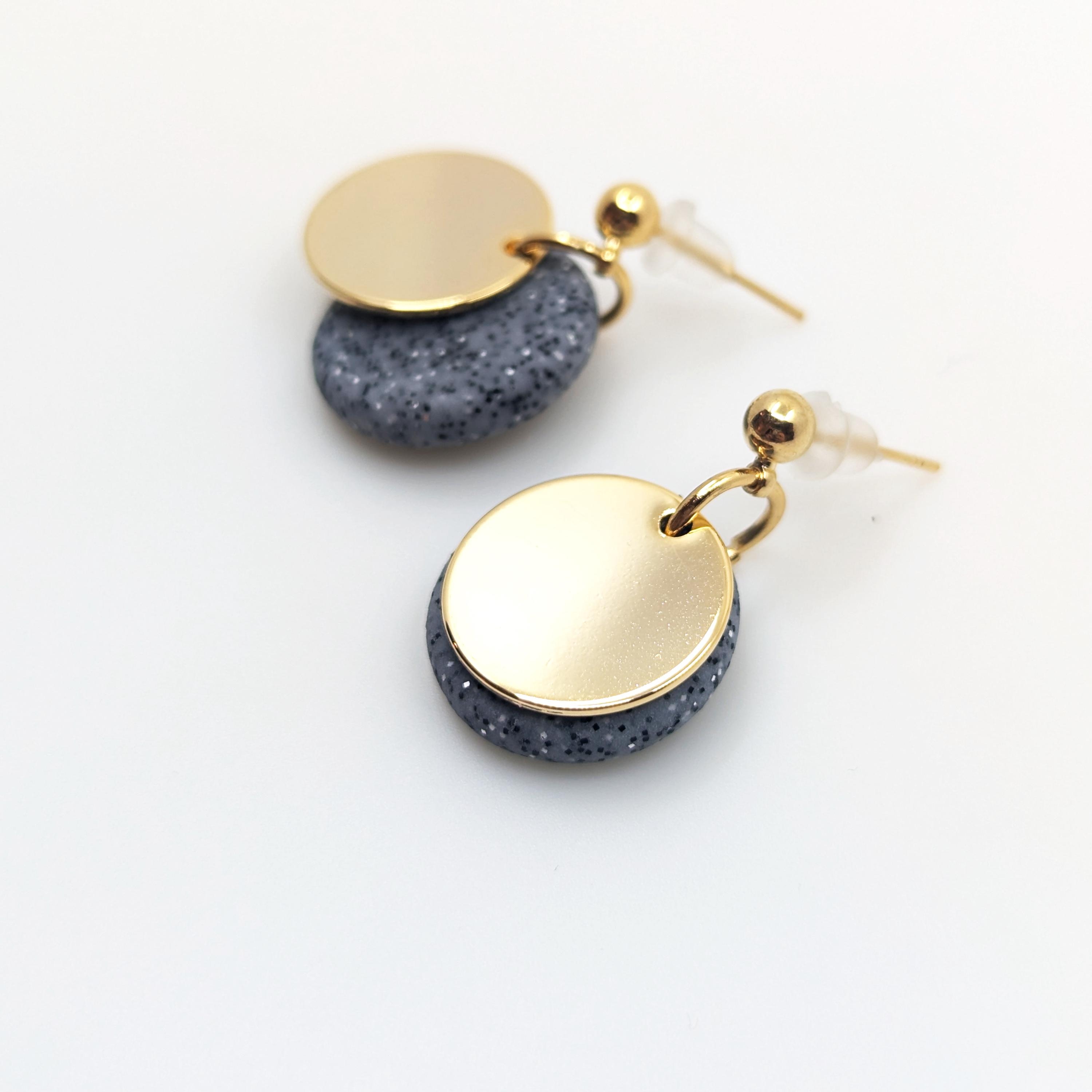 Les boucles d'oreilles PASTILLE sont constituées d'une pastille de laiton de 1,5cm et une autre en pâte polymère d'environ 1,8cm modelée à la main, montés sur un clou en laiton plaqué or.